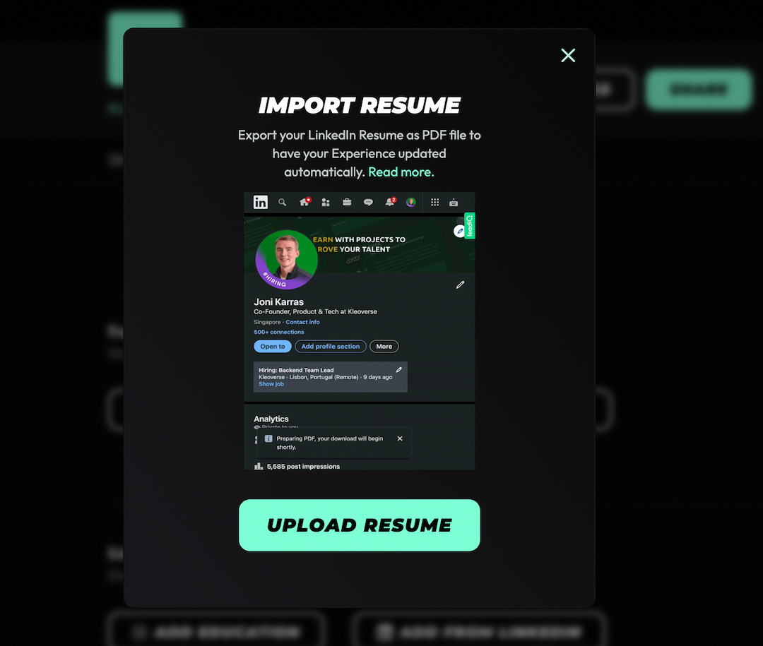 With just a click, you can effortlessly import your resume directly from LinkedIn to your Kleoverse profile page.