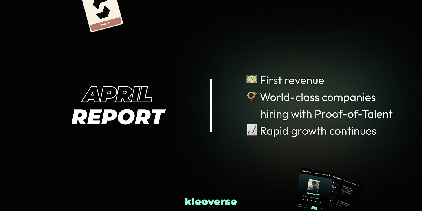 Kleoverse is building Proof-of-Talent to help developers verify skills on-chain, build web3 portfolios and find jobs. As we do this, we publish a community update on our progress once every month.
