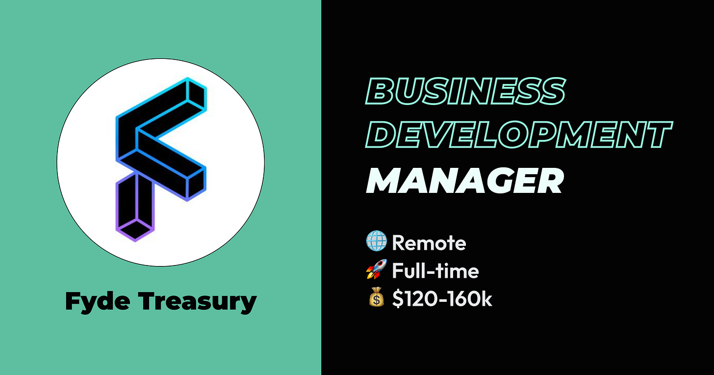Fyde Treasury is looking to hire a Business Development Manager to join their team. As a Business Development Manager, you will be responsible for driving revenue growth and client acquisition for our DeFi protocol.